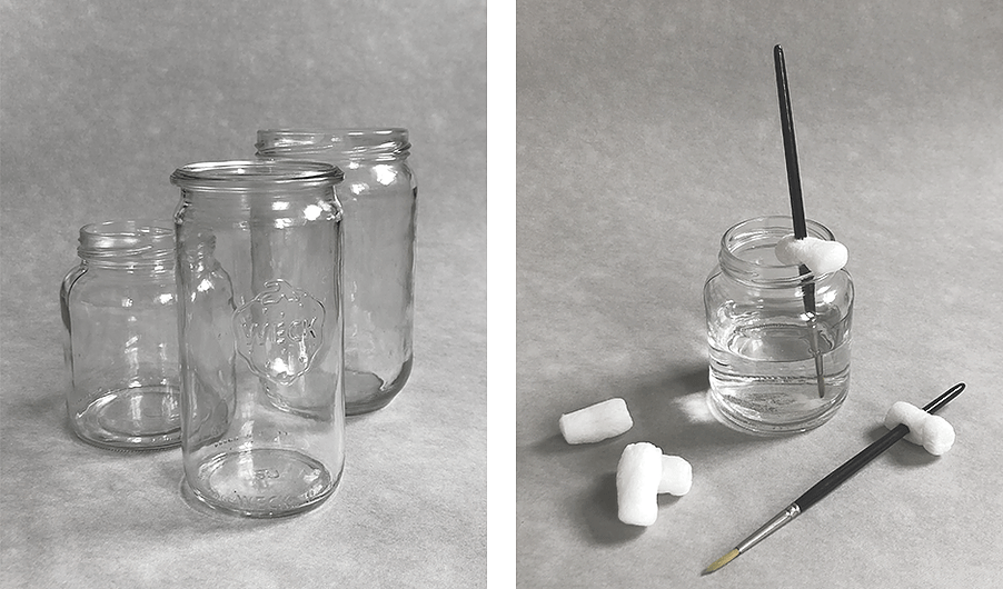 Na zdjęciu przedstawiamy prosty pomysł na wykorzystywanie zużytych słoiczków i orzeszków z pianki, którymi często wypełnione są paczki dostarczane przez kurierów. W taki sposób możemy zadbać o nasze pędzle, by nie zaschły w czasie pracy.